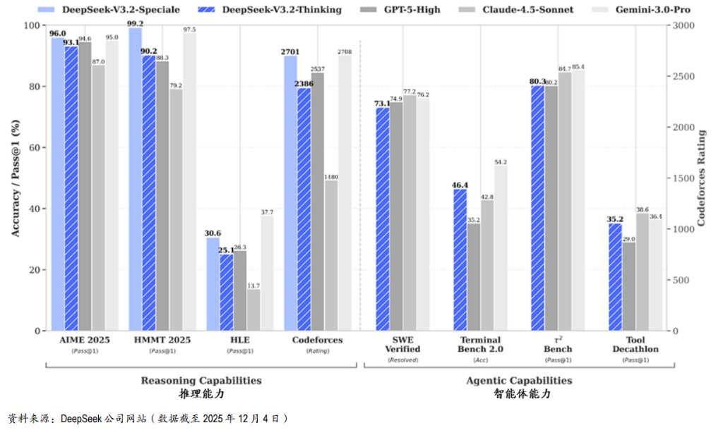 高端版本:Speciale 版本在奧林匹克級數學競賽和競爭性編程中表現優異,其推理基準已媲美 Gemini3.0Pro 和 GPT-5 級系統。