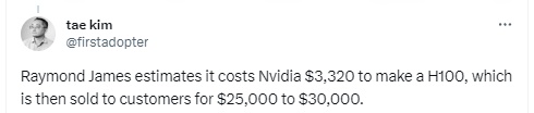 Tae Kim 援引的是金融諮詢公司 Raymond James 數據,H100 GPU 的成本為 3320 美元。目前尚不清楚成本分析有多深入,可能這是一個純粹的製造成本問題(在考慮良率的情況下平均每片晶圓和其他組件的價格),那麼 Nvidia 仍然需要支付大量的費用利潤。