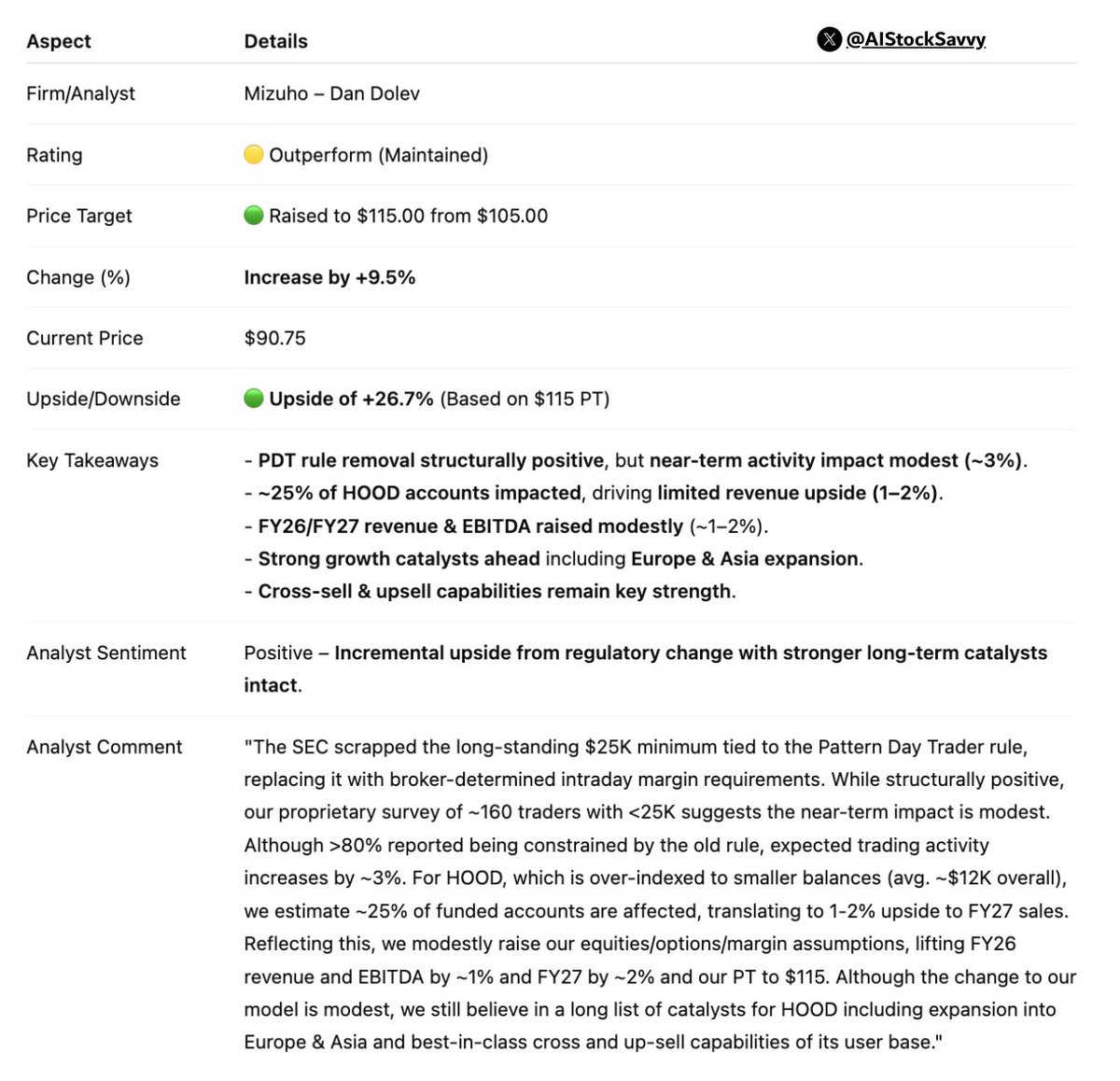 $Robinhood(HOOD.US) | 𝐑𝐨𝐛𝐢𝐧𝐡𝐨𝐨𝐝: Mizuho reiterates 𝐎𝐮𝐭𝐩𝐞𝐫𝐟𝐨𝐫𝐦, raises 𝐏𝐓 𝐭𝐨 $𝟏𝟏𝟓, 'we still believe in a long list of catalysts for HOOD'