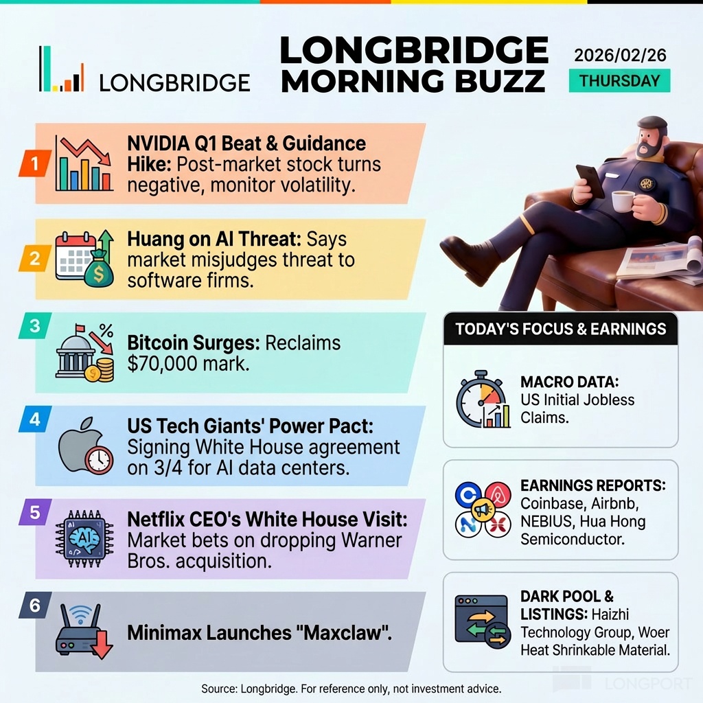 英偉達財報超預期但股價回落,比特幣重回 7 萬美元上方,AI 電力政治升温——以下是今晚美股開盤前新加坡投資者需要關注的內容👇