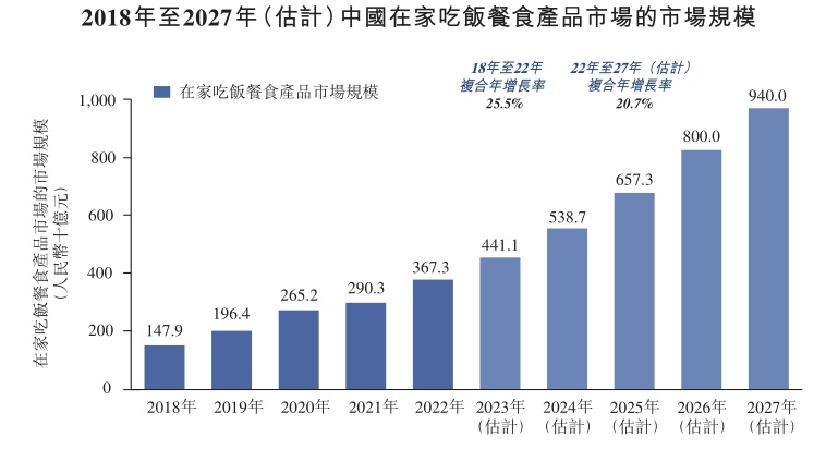 按零售額計,中國在家吃飯餐食產品市場的市場規模經歷強勁增長,由 2018 年的人民幣 1,479 億元增長至 2022 年的人民幣 3,673 億元,復合年增長率為 25.5%。由於消費者越來越傾向尋求方便且無需複雜烹飪技巧的健康用餐選擇,預計 2027 年的市場規模將達到人民幣 9,400 億元,自 2022 年的複合年增長率為 20.7%。隨着人們繼續將健康及保健放在首位,在家吃飯餐食產品的趨勢預計將繼續下去。