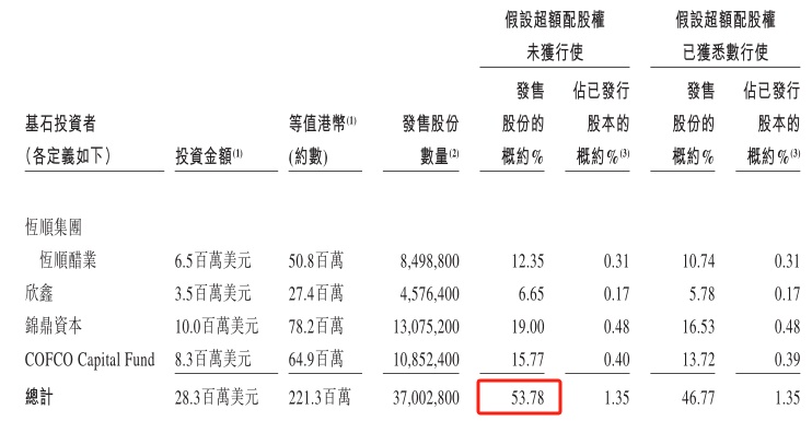一共有 4 基石,其中包括恆順醋業、欣鑫、錦鼎資本、COFCO Capital Fund 等,按發行價計算,基石合計共認購 2830 萬美元,佔總發行數的 53.78%,基石佔比還行。