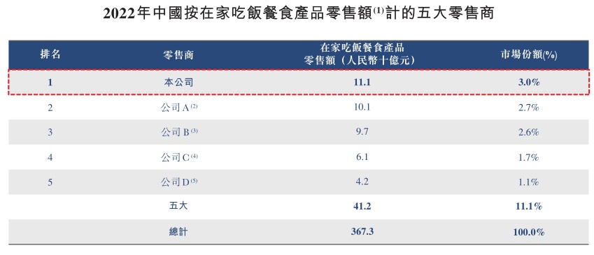 在中國所有零售商中,按 2022 年的在家吃飯餐食產品零售額計,五大零售商佔市場份額的 11.1%。於 2022 年,按在家吃飯餐食產品的零售額計,本公司是中國所有零售商中最大的在家吃飯餐食產品零售商,佔據 3.0% 的市場份額。此外,根據弗若斯特沙利文的資料,按在家火鍋及燒烤產品的零售額計算,於 2022 年本公司為中國所有供應商中最大的在家火鍋和燒烤產品供應商,佔 12.7% 的市場份額。