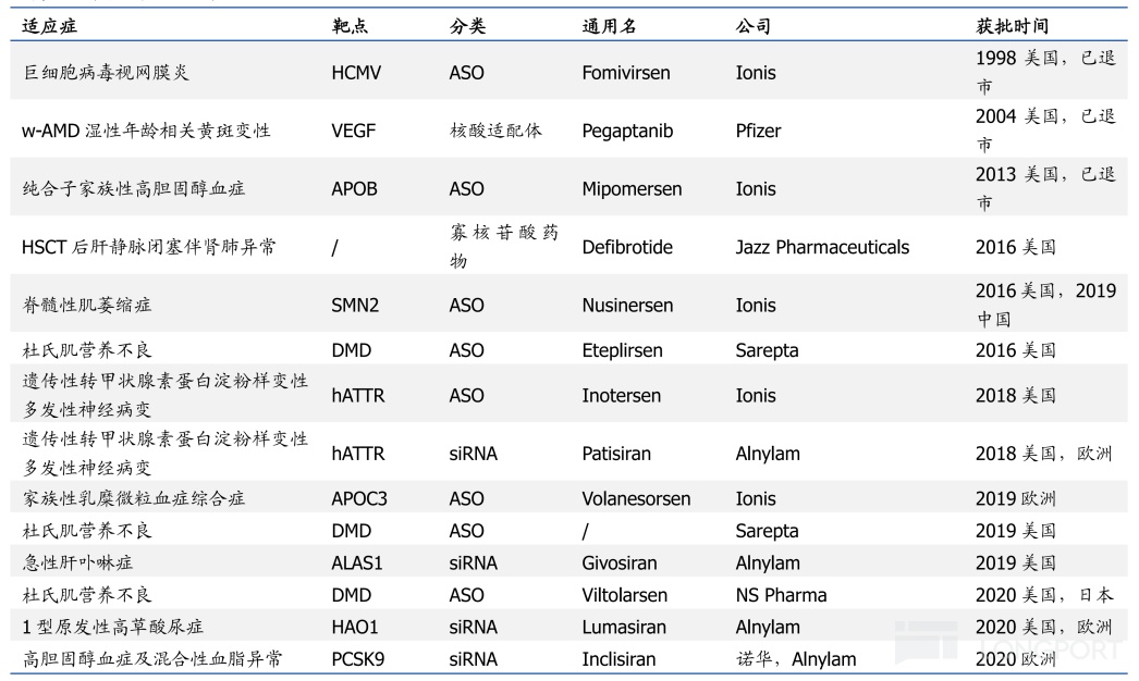 早期獲批上市的小核酸藥物,多針對基因缺陷型疾病和罕見病,例如脊髓性肌萎縮症或杜氏肌營養不良等。