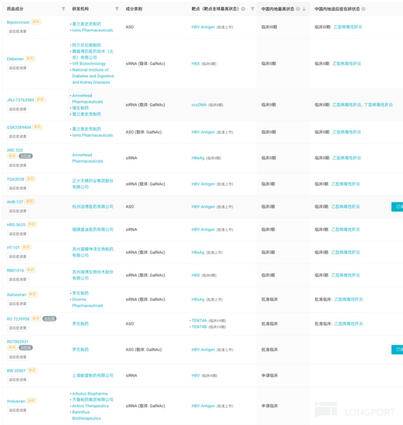 國內進入臨牀階段針對慢性乙肝適應症小核酸藥物(siRNA+ASO)