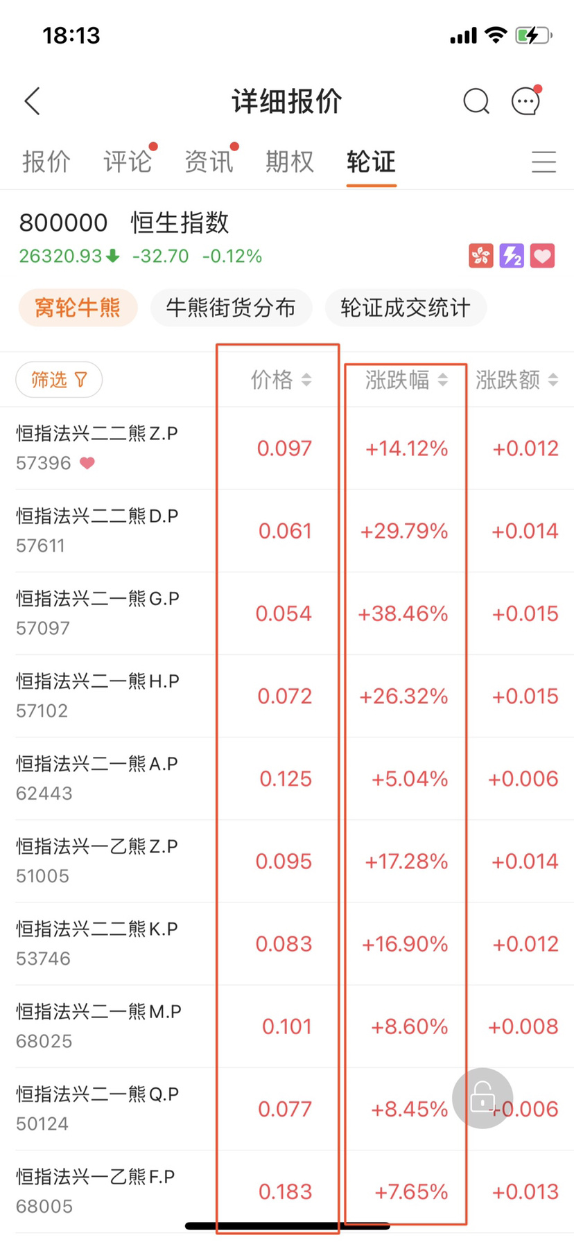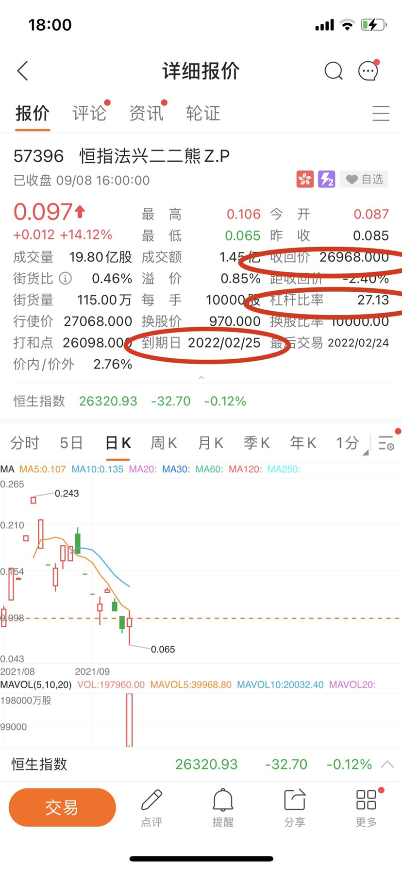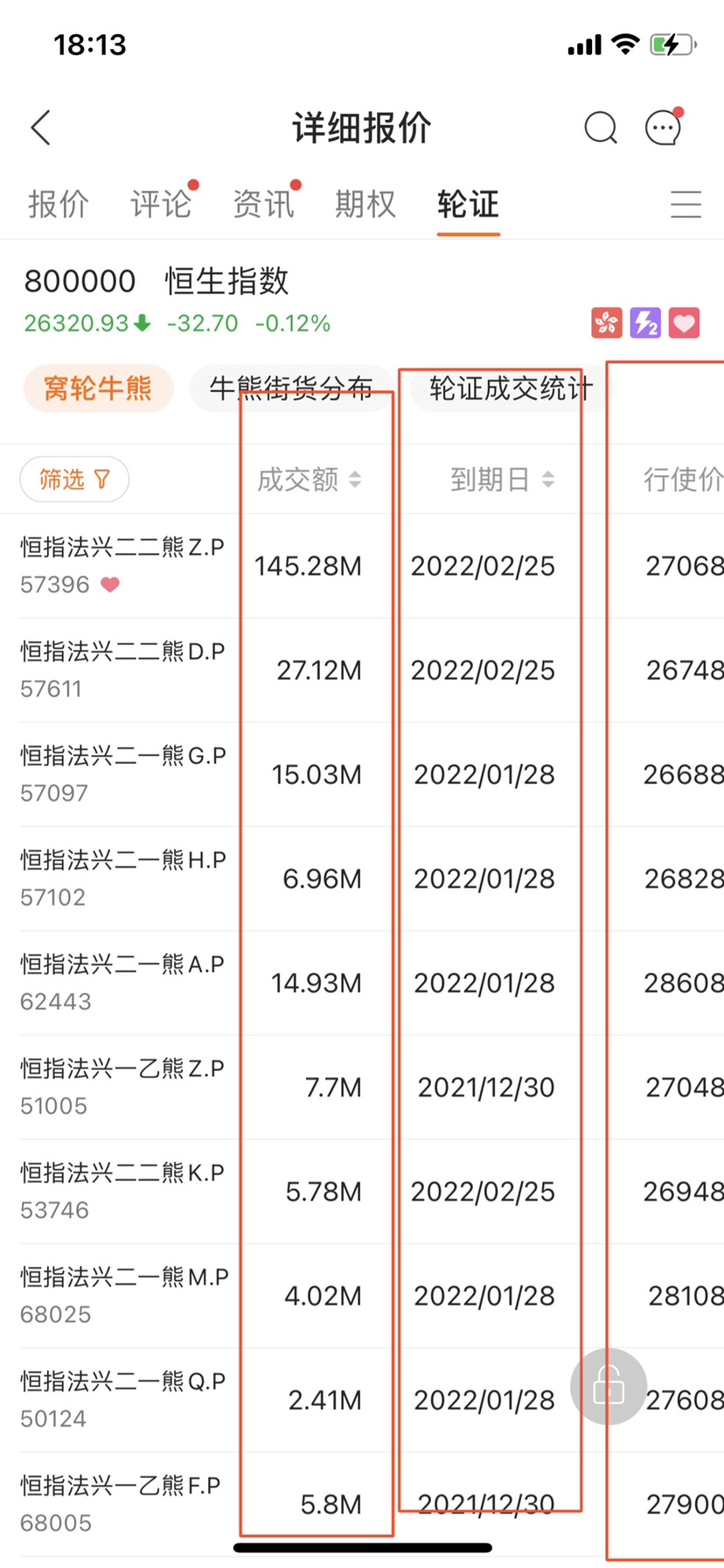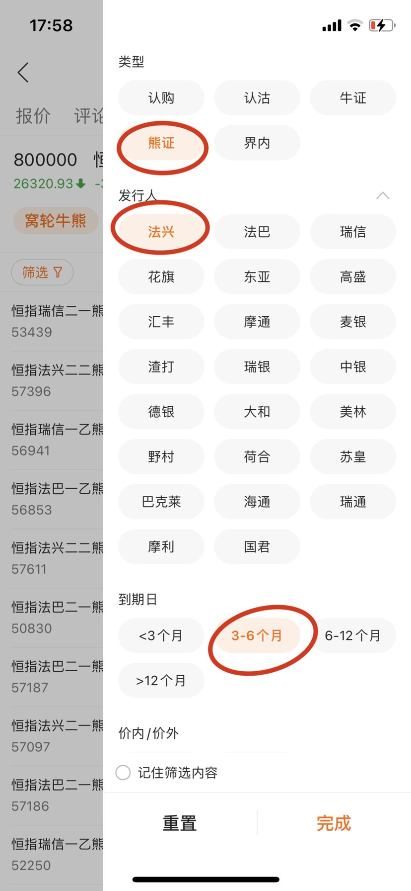 圖二點擊熊證後小夥伴們都能看見一堆發行人,那為什麼圖三選擇法興呢?別的不是全不好,而是除了法興,摩通以外其它的交易量相對較少,延伸波幅比較頻繁,比如你買熊明明恒指在跌,它們熊證反而不漲的情況發生,還有就是在你沒有過多時間去排查的情況下,法興,摩通是比較穩妥且快速的方式,接着就是圖二下面的到期日為什麼選擇 3 月以內或者 3 至 6 個月呢,因為牛熊證都有到期日,時間長百分比漲速慢,時間過短也同樣會出現別人漲 1 分你的卻漲幾厘,所以一般我們都會選擇 3 至 6 個月為主,然後看接下來圖三、圖四️