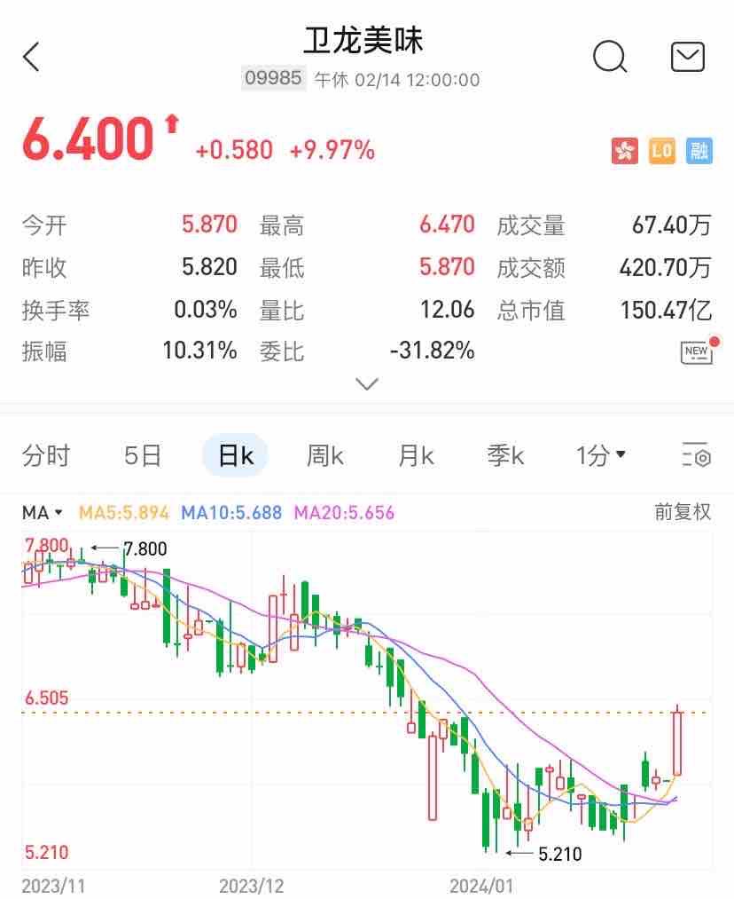 綜上所述,衞龍美味股價的上漲是多重因素共同作用的結果。在未來,隨着消費市場的持續復甦和公司基本面的不斷改善,衞龍美味的股價有望繼續保持上漲態勢。然而,投資者也應注意風險,理性分析公司的基本面和技術面,做出明智的投資決策。$衛龍美味(09985.HK)