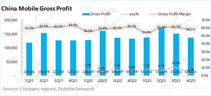中國移動 2023 年第四季度毛利率 58.5%,同比下滑 4.2pct。海豚君將 “網絡運營及支撐成本” 和 “銷售產品成本” 列為營業成本,進而測算公司毛利及毛利率情況。本季度兩項成本的提升速度超過收入增速,進而帶動公司毛利率端的下滑。
