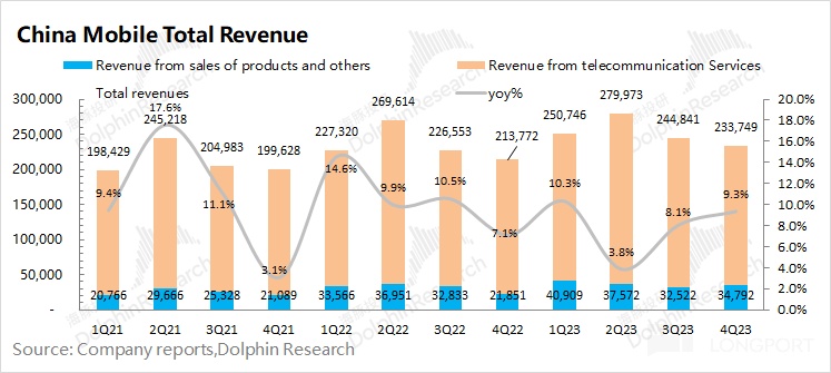 中國移動 2023 年第四季度總營收 2337.5 億元,同比增加 9.3%,基本符合市場預期(2367 億元)。公司本季度的收入增長,主要來自於寬帶業務和應用及信息服務業務的帶動。
