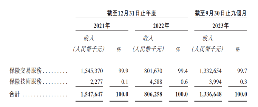 從招股書提供的財務數據來看,手回科技的營收包括保險交易服務與保險技術服務,從收入佔比來看,保險交易服務的營收佔比超過 99%。保險技術服務營收佔比僅 0.3%,科技成色不足。