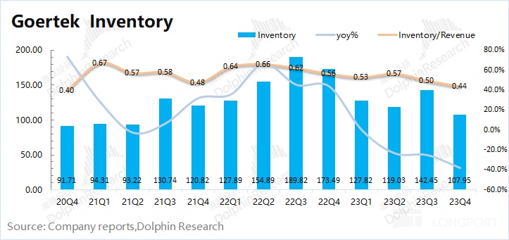 ②存貨:歌爾股份 2023 年第四季度存貨 107.95 億元,同比下滑 37.8%。從存貨/營業收入指標看,歌爾股份本季度繼續下滑至 0.44。當前歌爾的存貨水位大幅下降,是受部分下游需求疲軟的影響,公司也相應的調整了存貨的儲備情況。雖然存貨結構相對合理,但這波庫存去化並不是需求帶動的。
