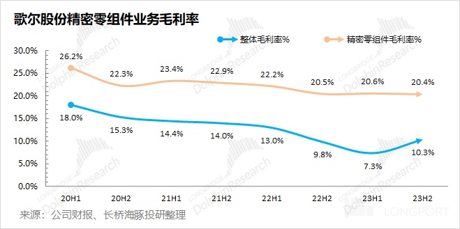 歌爾股份精密零組件業務 2023 年下半年毛利率為 20.4%,同比下滑 0.1pct。公司精密零組件毛利率整體穩定在 20% 左右水平。