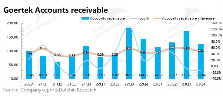 ①應收帳款:歌爾股份 2023 年第四季度應收帳款 125.64 億元,同比下滑 12.9%。從應收帳款/營業收入指標看,歌爾股份本季度為 0.51,維持在相對合理水位。
