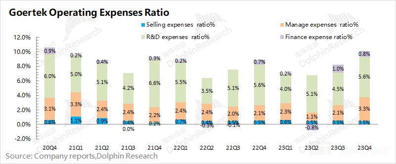2023 年第四季度歌爾股份四項費用合計 24.92 億元,同比減少 9.2%。四項費用率 10.1%,四項費用率的下滑主要來自銷售費用和研發費用的減少。
