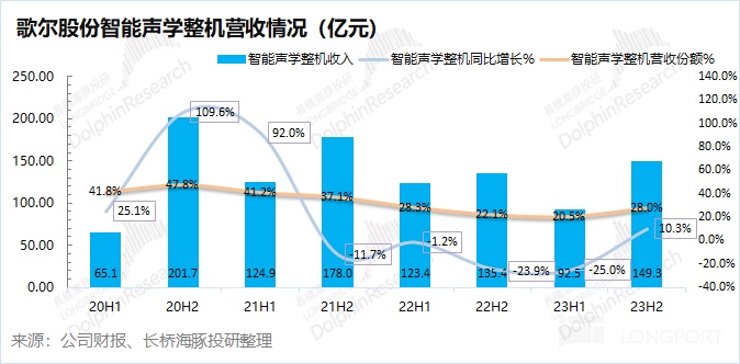 歌爾股份智能聲學整機業務 2023 年下半年實現收入 149.3 億元,同比增長 10.3%。歌爾股份的智能聲學整機業務主要仍是以蘋果的 TWS 產品為主。