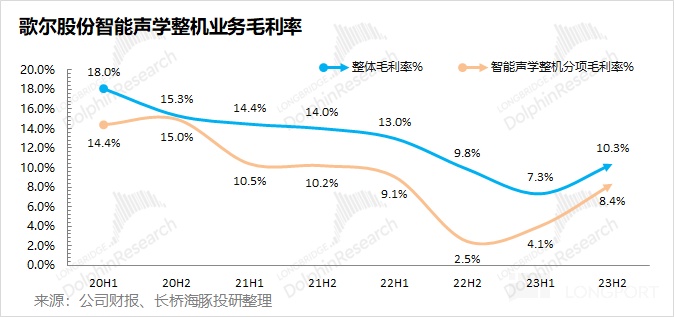 歌爾股份智能聲學整機業務毛利率在 2023 年下半年回升至 8.4%,同比提升 5.9pct。隨着出貨量及產能利用率的回升,公司智能聲學整機的毛利率也有所修復。