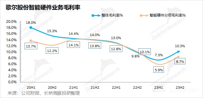 綜合看智能硬件毛利率和整體毛利率,兩者變化上越來越趨同。主要是由於智能硬件業務佔比已經達到一半以上,對公司整體毛利率影響較大。