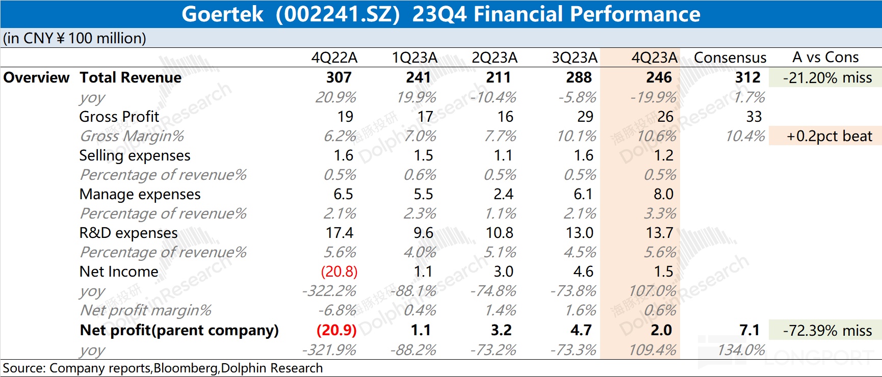 歌爾股份 2023 年第四季度總營收 246 億元,同比下滑 19.9%,低於市場預期(312 億)。營收下滑,主要受智能硬件和精密零組件業務下滑的拖累。