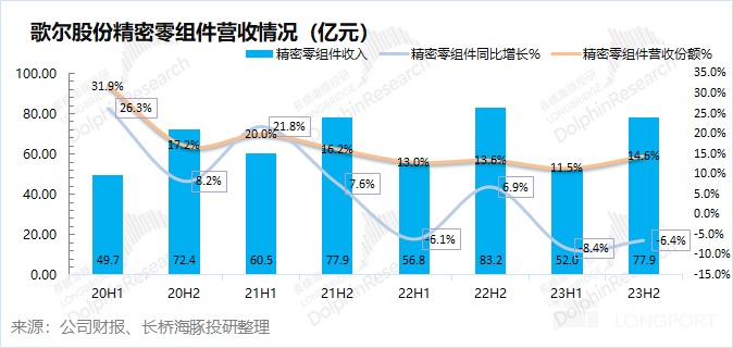 歌爾股份的精密零組件業務 2023 年下半年實現收入 77.9 億元,同比下滑 6.4%。歌爾的精密零組件業務,主要包括 MEMS、mic 等電子器件。該業務原本主要應用於手機領域,隨着智能硬件中更多零組件的導入,給零組件業務帶來一定的支撐。