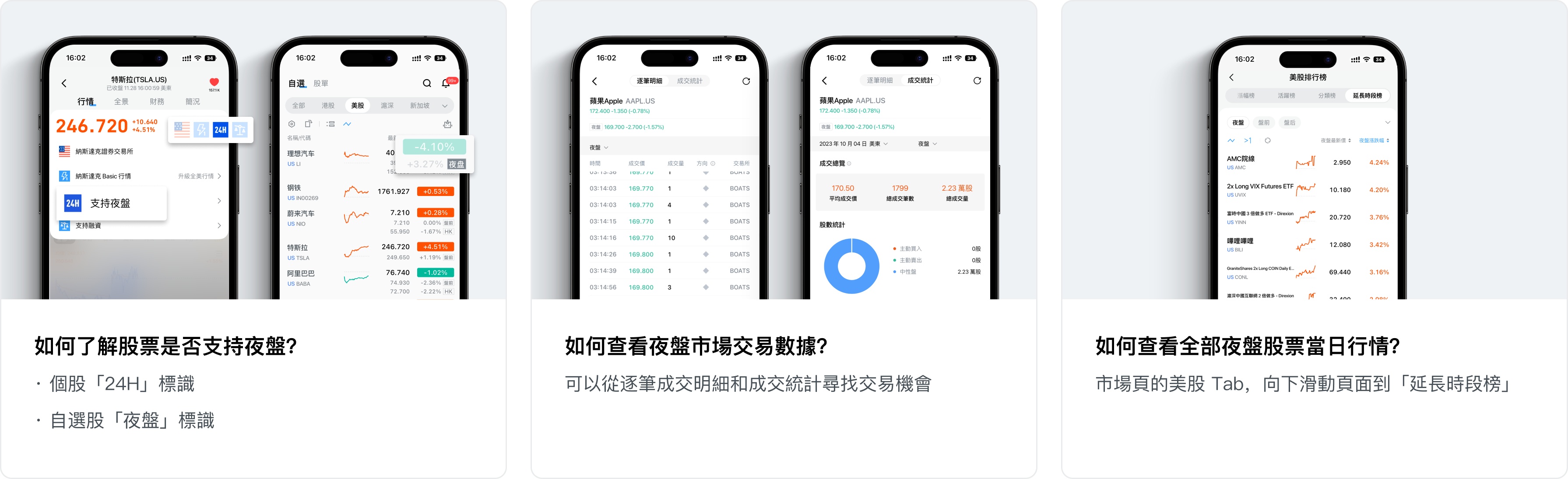 在關注頁列表和個股詳情頁看是否帶有「夜盤」或「24H」標誌;