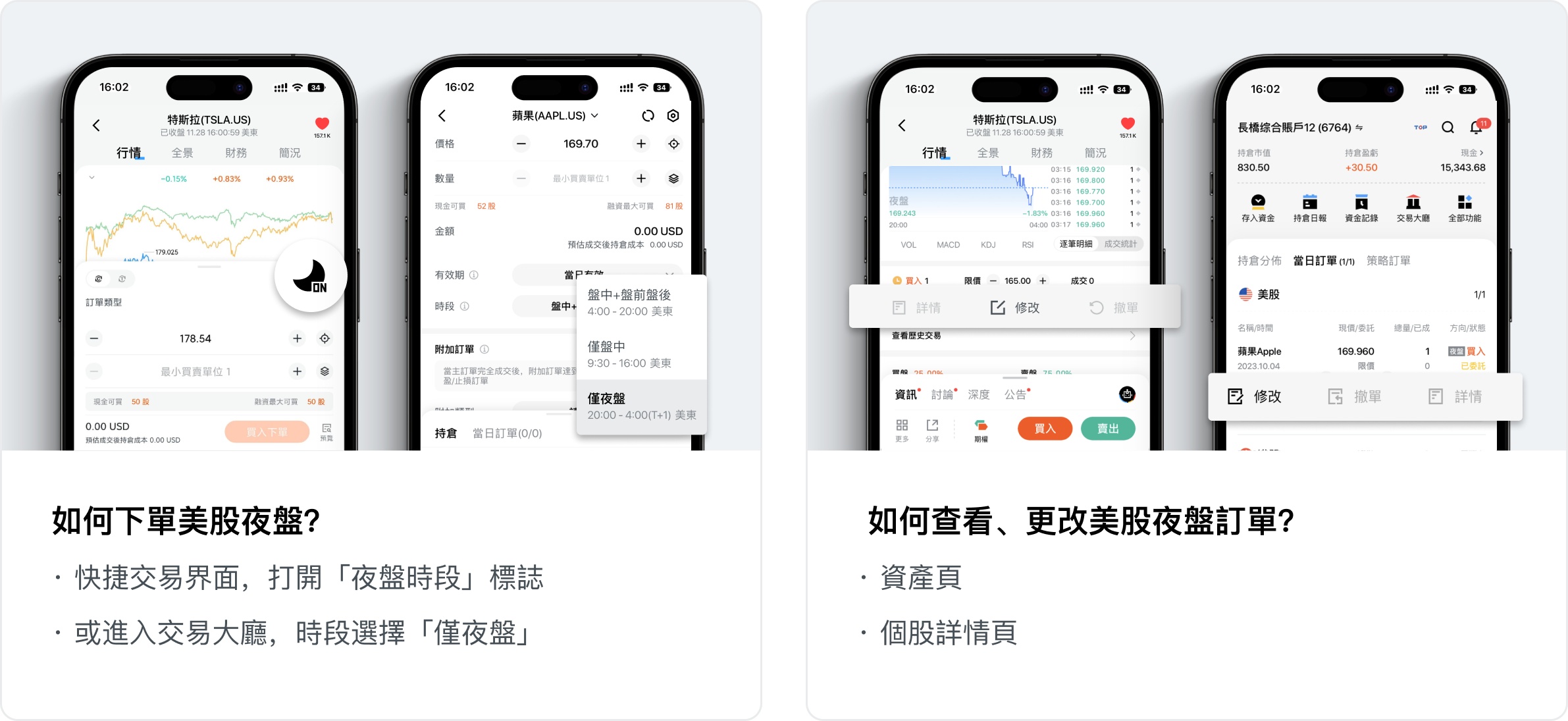 選擇想要交易且支持美股夜盤的股票標的,打開快捷交易抽屜或進入交易大廳,注意確認已選擇「夜盤時段」: