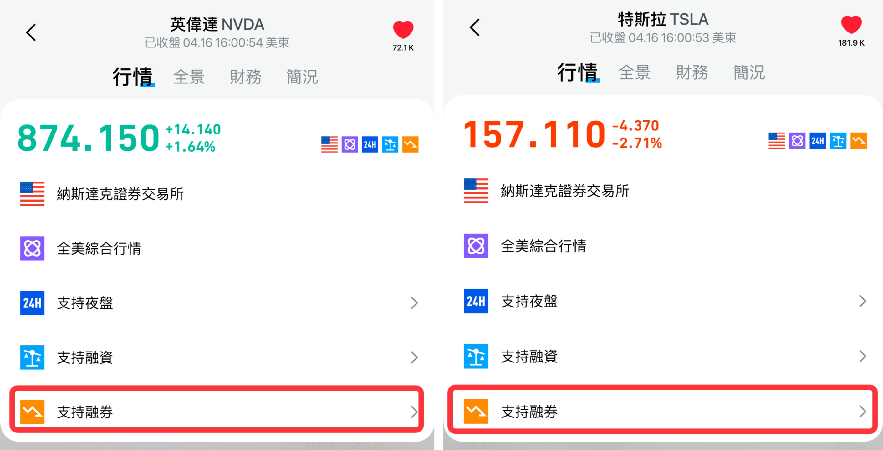 大部分美股夜盤支持賣空,需要您注意股票詳情頁的右上方是否帶有「融券」標誌: