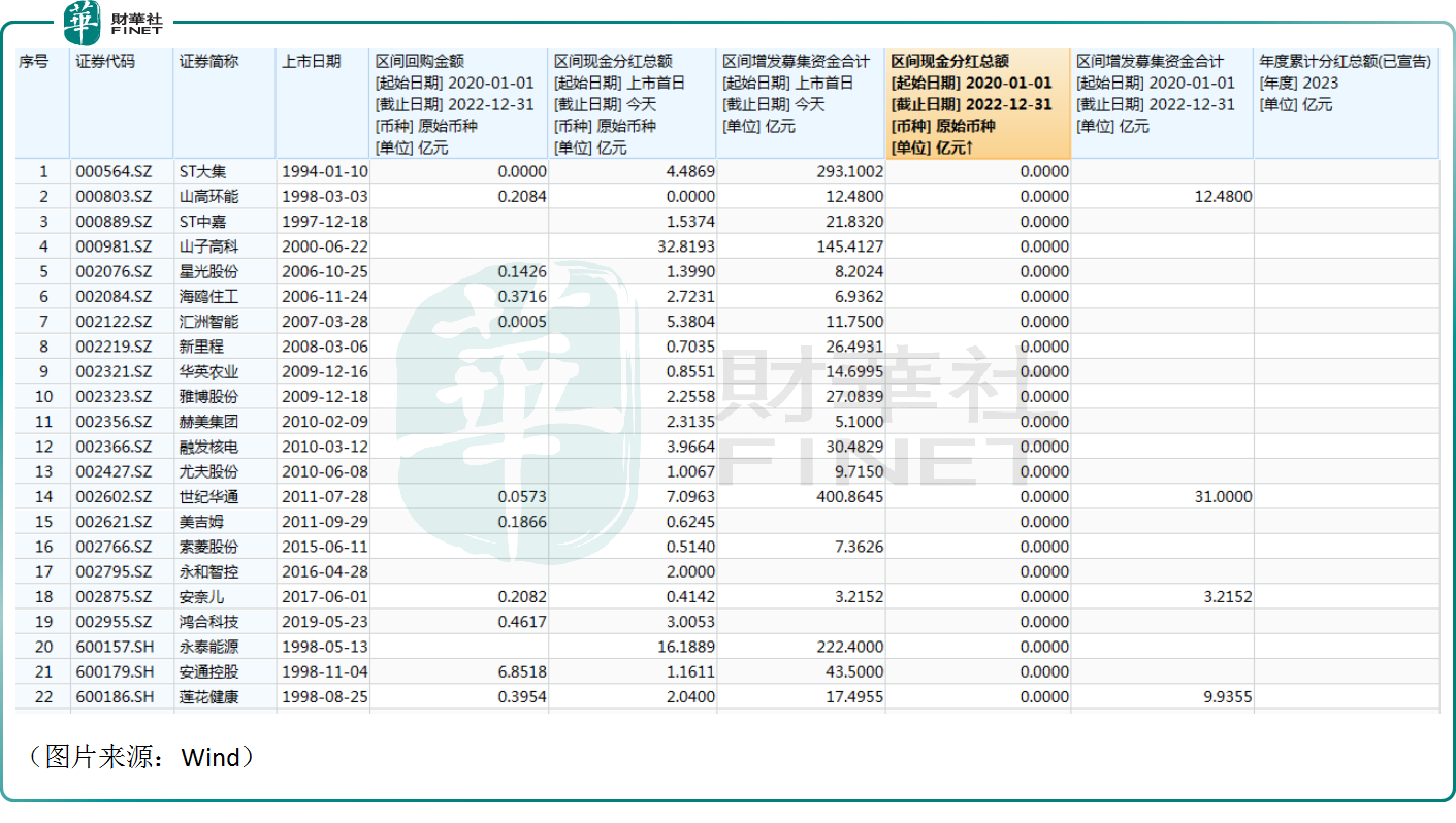 Wind 數據顯示,在滬深兩市的主板市場,2020 年-2022 年期間,有 36 家公司沒有進行任何的現金分紅,包括山高環能、新里程、庚星股份、安奈兒、安通控股、金盃汽車等。