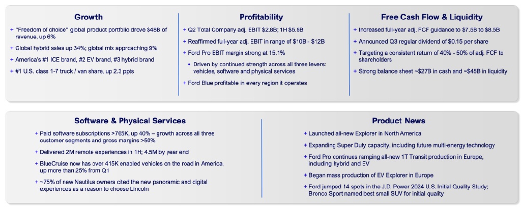 歸根結底,公司的發展還是要看其盈利能力。福特各業務部門的財務狀況總體良好,第二季度公司重申了全年調整後的 EBIT(息税前利潤)將在 100 億美元至 120 億美元之間的預測。