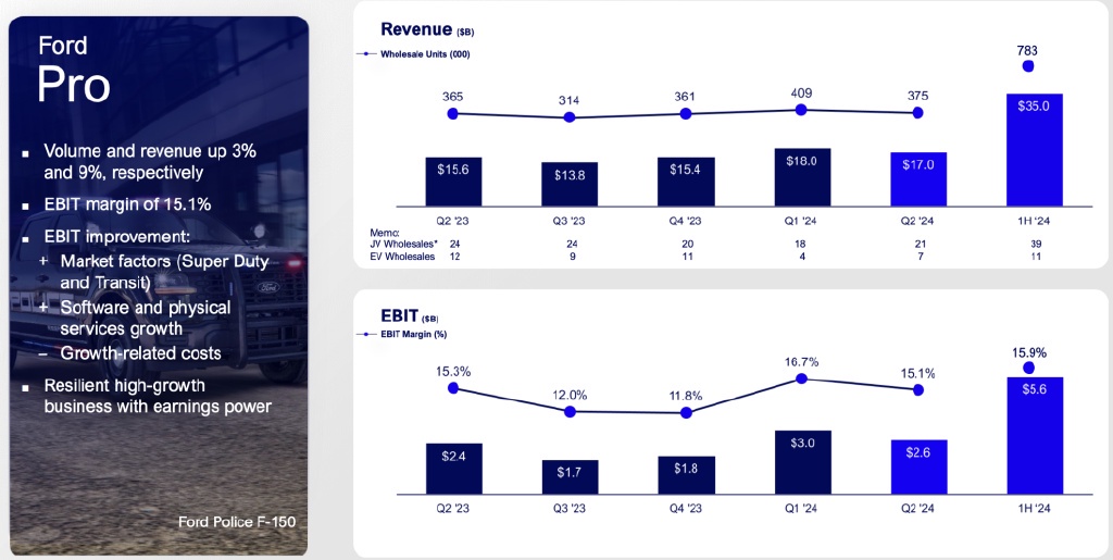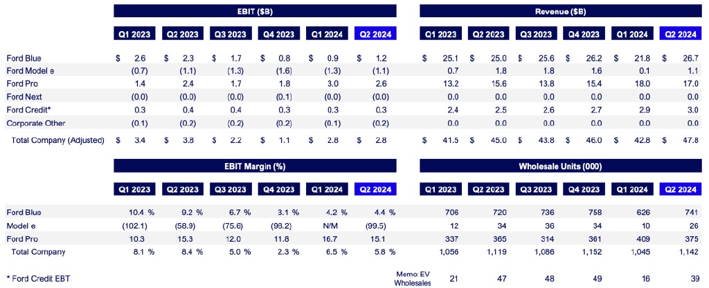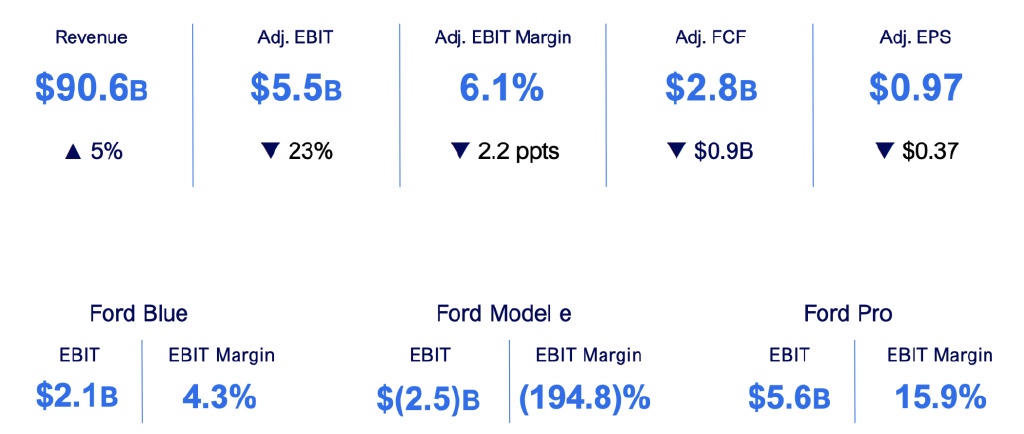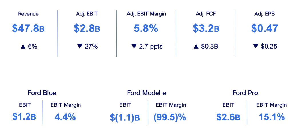 電動汽車部門虧損了 25 億美元。整體收入為 906 億美元,同比增長 5%;調整後的 EBIT 為 55 億美元,EBIT 利潤率為 6.1%,調整後的 EPS 為 0.97 美元。福特 Blue、福特 Model e 和福特 Pro 的 EBIT 分別為 21 億美元、-25 億美元和 56 億美元。