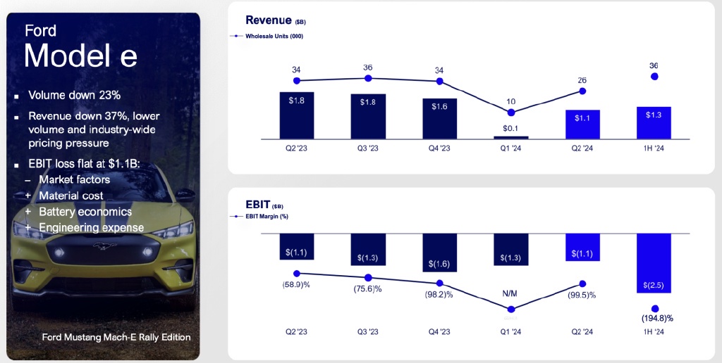 現在福特最大的窟窿就在電動汽車部門 Model e,從季度數據來看,銷量下降了 23%,收入下降了 37%,EBIT 虧損持平在 11 億美元。