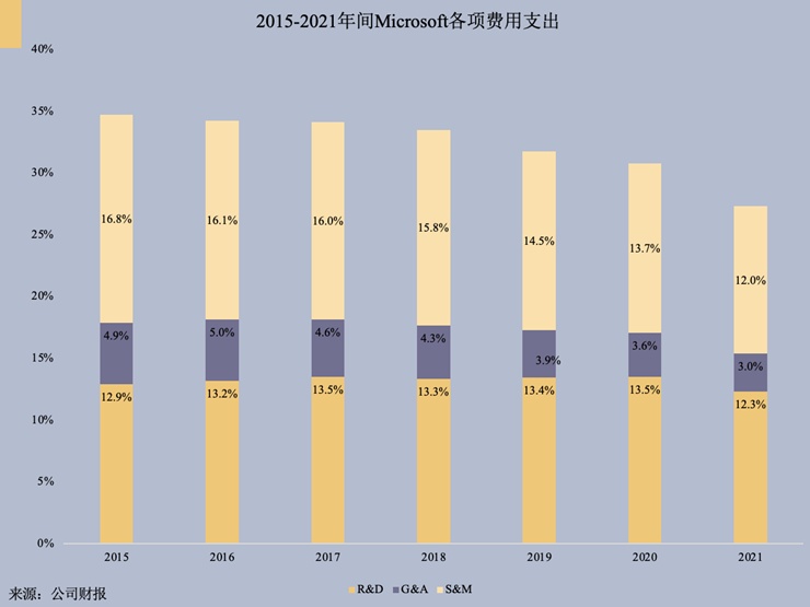 費用角度來看。公司成本佔比為 21.1%,研發投入佔比 12.3%(2021 年首次超過市場營銷投入佔比,佔比穩步下降),2017-2021 CAGR 是 10%,2015-2021 CAGR 是 8%; 市場營銷投入佔比 12%,佔比穩步下降,2017-2021 CAGR 是 5%,2015-2021 CAGR 是 4%,年化增速低於研發投入增速;行政管理費用佔比 3%,佔比逐年下降,2017-2021 CAGR 是 3%,2015-2021 CAGR 是 1%。公司整體費用投入較大偏向研發,營銷費用和行政費用佔比都在下降,體現出向好的營運效率。