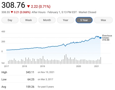 過去 7 年(2015-2021)的平均的盈利是$35.294 BN,按公司 2022 年 2 月 1 收盤價,公司市值為 2331.376BN,由此看,公司的市盈率是 66 倍,仍處於絕對高位。需等長期市盈率低於 20 時方可買入,即市值達到 705.88BN,較 2022 年 2 月 1 日收盤價跌 69.7% 以上。