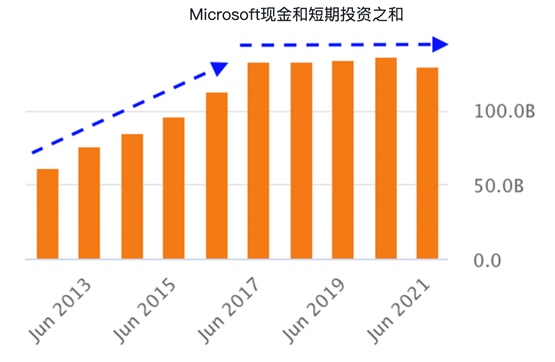 業績處於快速發展期,淨利潤增長快於營收增長,現金流增速放緩。Microsoft 2022 FY22Q2 營業收入是 517 億美金,同比增長 20%;淨利潤是 188 億美金, 同比增長 21%;自由現金流是 86 億美金,同比增長 3%,主要是雲業務資本性支出上升所致。公司淨利率為 36%,自由現金流比率(自由現金流/營業收入)是 17%,FY 2017-2021 營業收入 CAGR 是 12%,淨利潤 CAGR 是 38%,FCF CAGR 是 13%。2015-2021 營業收入 CAGR 是 9%,淨利潤 CAGR 是 29%,FCF CAGR 是 14%。近五年來,公司營收、淨利潤增速加快,但 FCF 增速放緩,顯示出經營狀況改善,但財務狀況略有惡化。公司整體現金和短期投資之和從 2016 年開始就陷入停滯,大概在 1300 億美金左右。