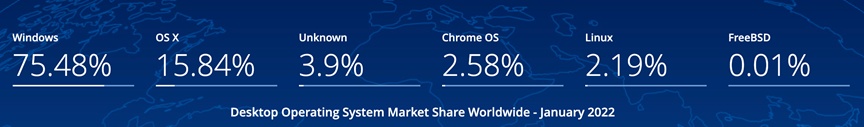 電腦操作系統。根據 Businesswire, 全球電腦操作系統市場規模為 1.9 千億美元,公司旗下 Windows 佔據公司了 75% 的市場份額,遠遠領先其他競爭對手。