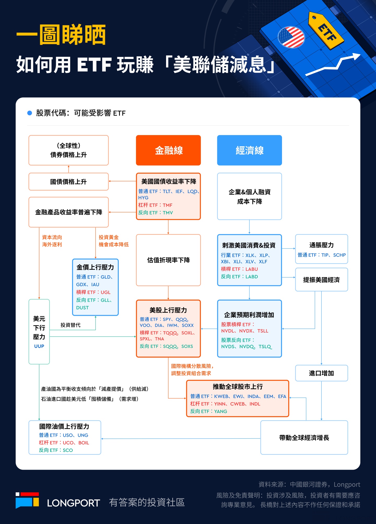 下圖詳細列出了聯儲局減息對金融和經濟體系的影響因果關係,以及相關的 ETF 信息,方便投資者做出決策: