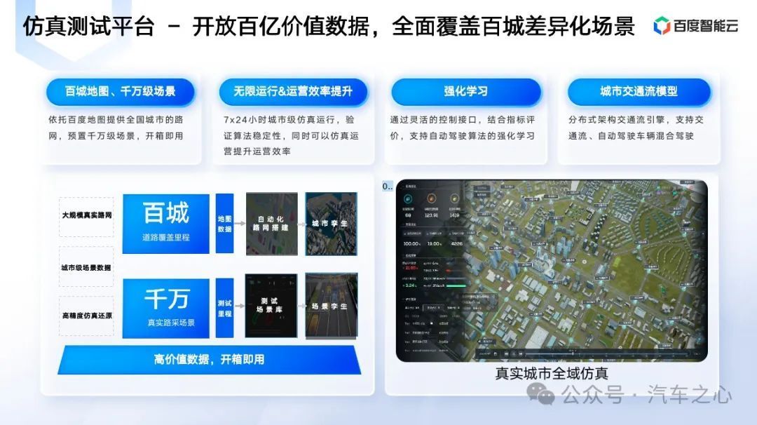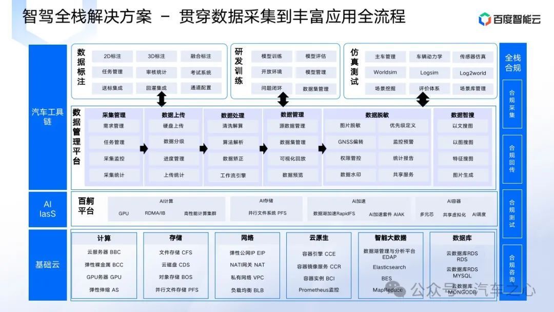 而以百度為代表的智能雲服務商都看準了這種為車企賦能的巨大機遇,在汽車雲建設上打造了一整套數據工具鏈,貫穿數據採集、標註、管理、仿真、測試等全流程,支持了業內大批企業自動駕駛服務的落地發展。