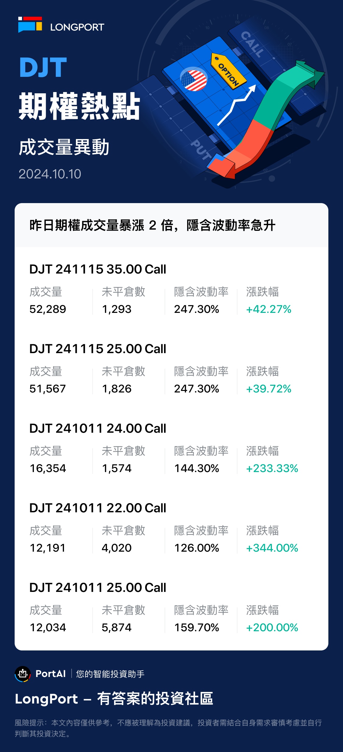 特朗普概念股(DJT)近期持續反彈,本週至今大漲 46%,隔夜大漲 17%。期權成交量昨日大增至超過 40 萬張,其中,10 月 11 日到期的多只期權大漲 300% 以上。