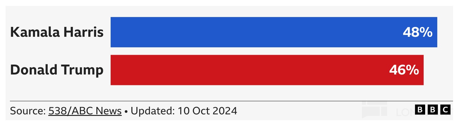 在 BBC 的民意調查中,特朗普勝選率低於哈里斯,分別為 46%、48%,差距較之前縮小(數據截止 10 月 10 日):