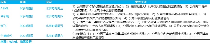 本週正式進入美股的三季度財報,打頭的兩家半導體巨頭 ASML 和台積電可能會對近期半導體的再次拉漲會有一定的信息透出。此外奈飛這次的向上週期尤其長,下半年內容競爭是否加劇值得關注。此外,寧德時代作為近期創業板的主力,被拉漲的非常厲害,但公司三季度業績是否能夠撐起如此大的漲幅,也值得關注。