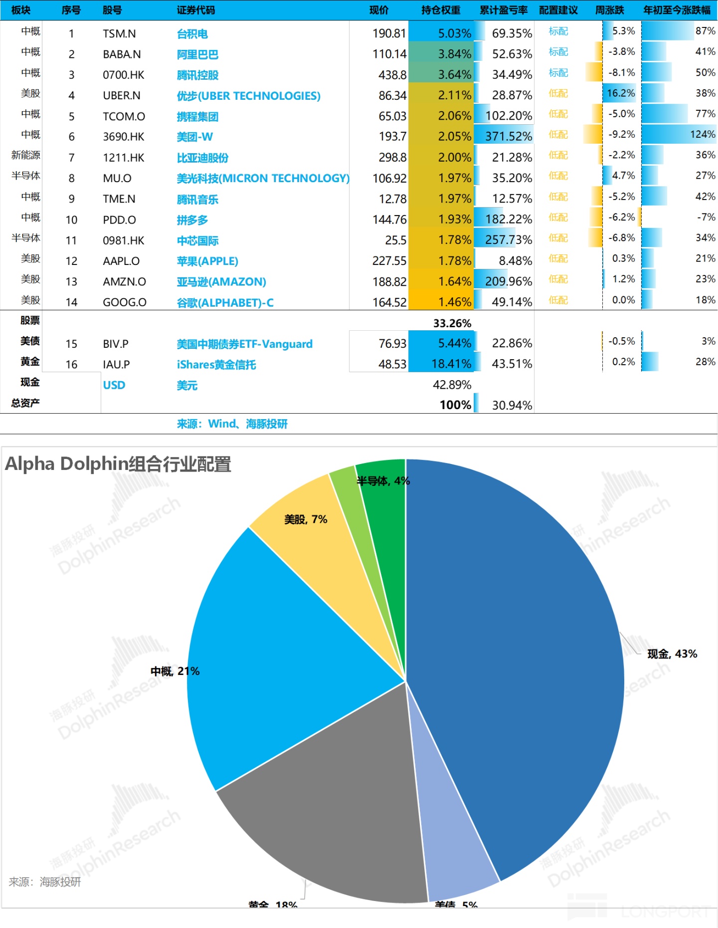 Alpha Dolphin 虛擬組合共計持倉 14 只個股與權益型 ETF,其中標配 3 只,8 只權益資產為低配。其餘分佈在了黃金、美債和美元現金上。截至上週末,Alpha Dolphin 資產配置分配和權益資產持倉權重如下: