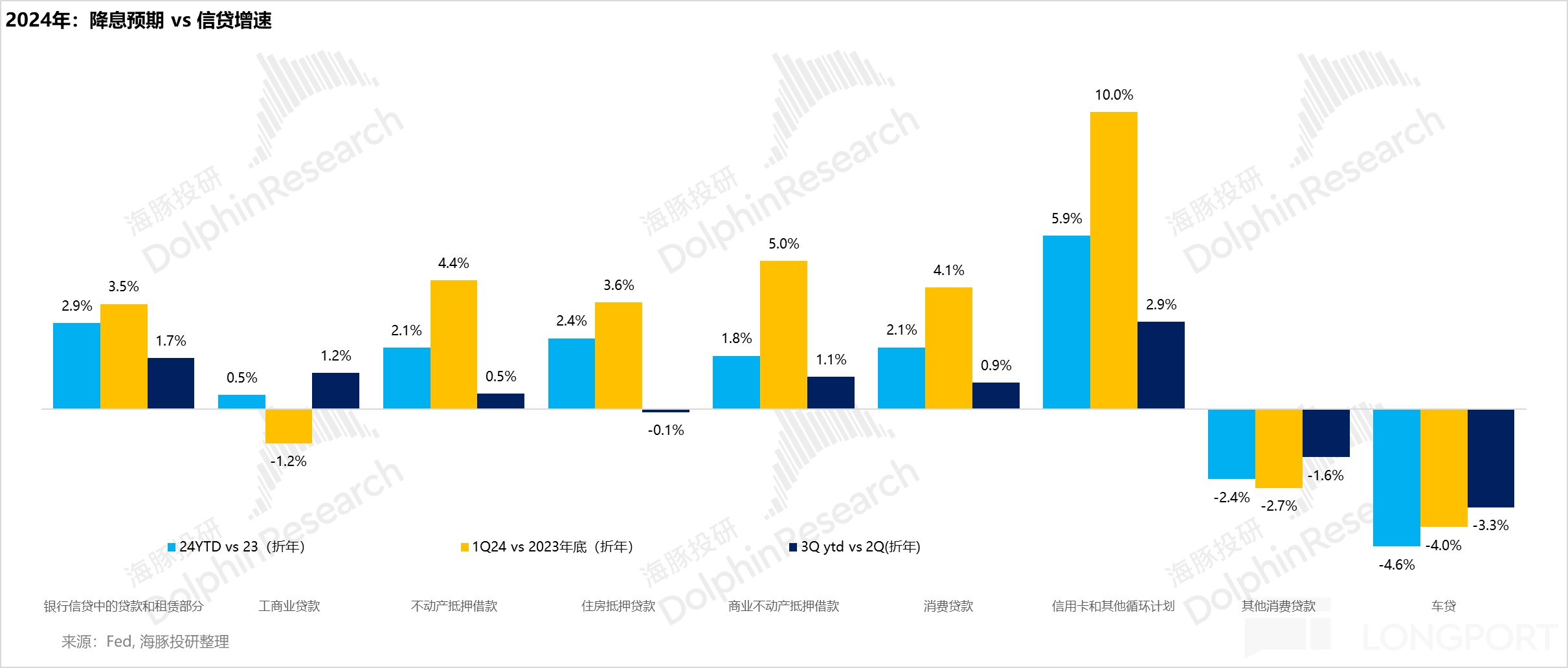 這恐怕也是導致十年期美債快速拉漲到 4% 以上的主要因素。但這裏一個有意思的地方是,在這次通脹上升過程中,居民和企業的借貸行為增長並不明顯,甚至是進一步放緩的,也就是説目前這個 50 個基點的降息,遠沒有刺激到居民去加槓桿,並非是降息刺激居民和企業借貸導致的。
