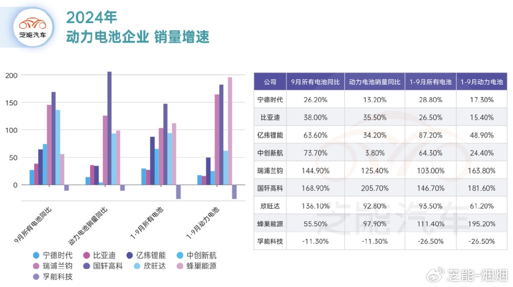 在月度報告裏面,我們能看到寧德時代的銷售增速和出口增速,如下圖所示,寧德時代所有口徑的電池增長 26.2%,但是動力電池只有 13.2%。同樣 1-9 月總量和動力電池部分也差了 10 個點的增速。