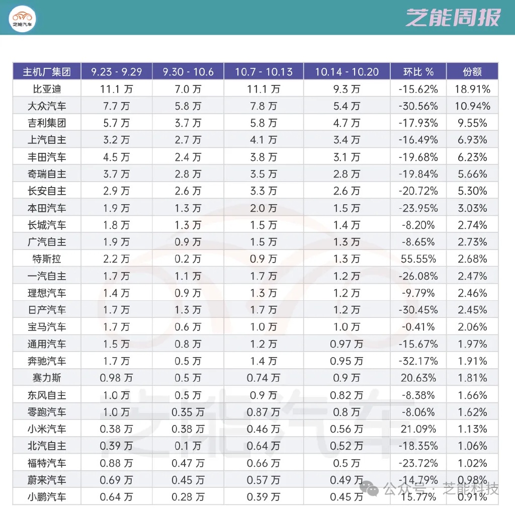 42 周(10 月 14 日-10 月 20 日),比亞迪集團總銷量為 9.3 萬輛,總體銷量排在第一位。