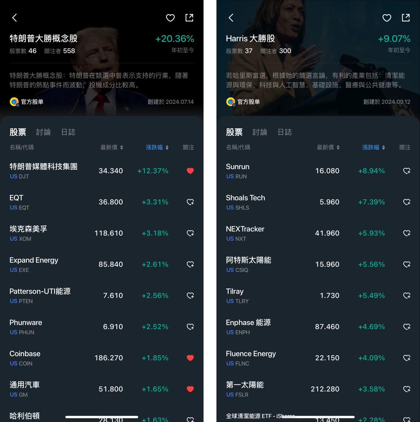 雙方勝選的相關概念股,可以通過 “市場 - 發現 - 官方股單” 查看: