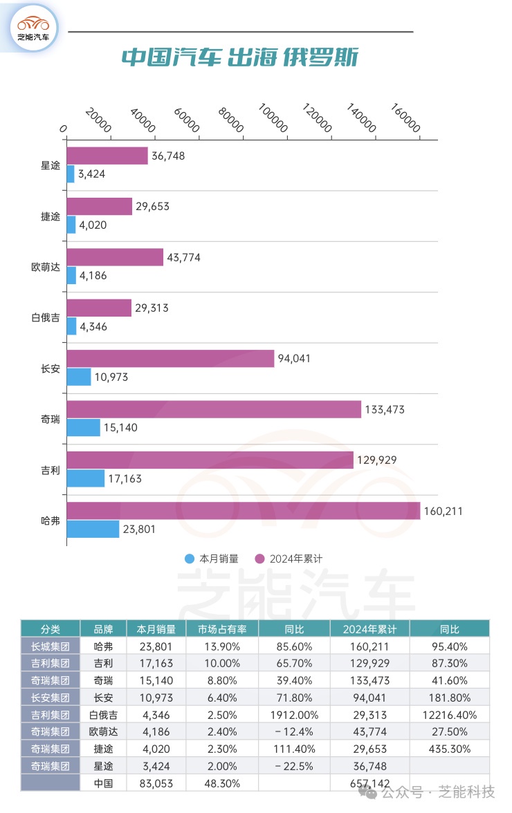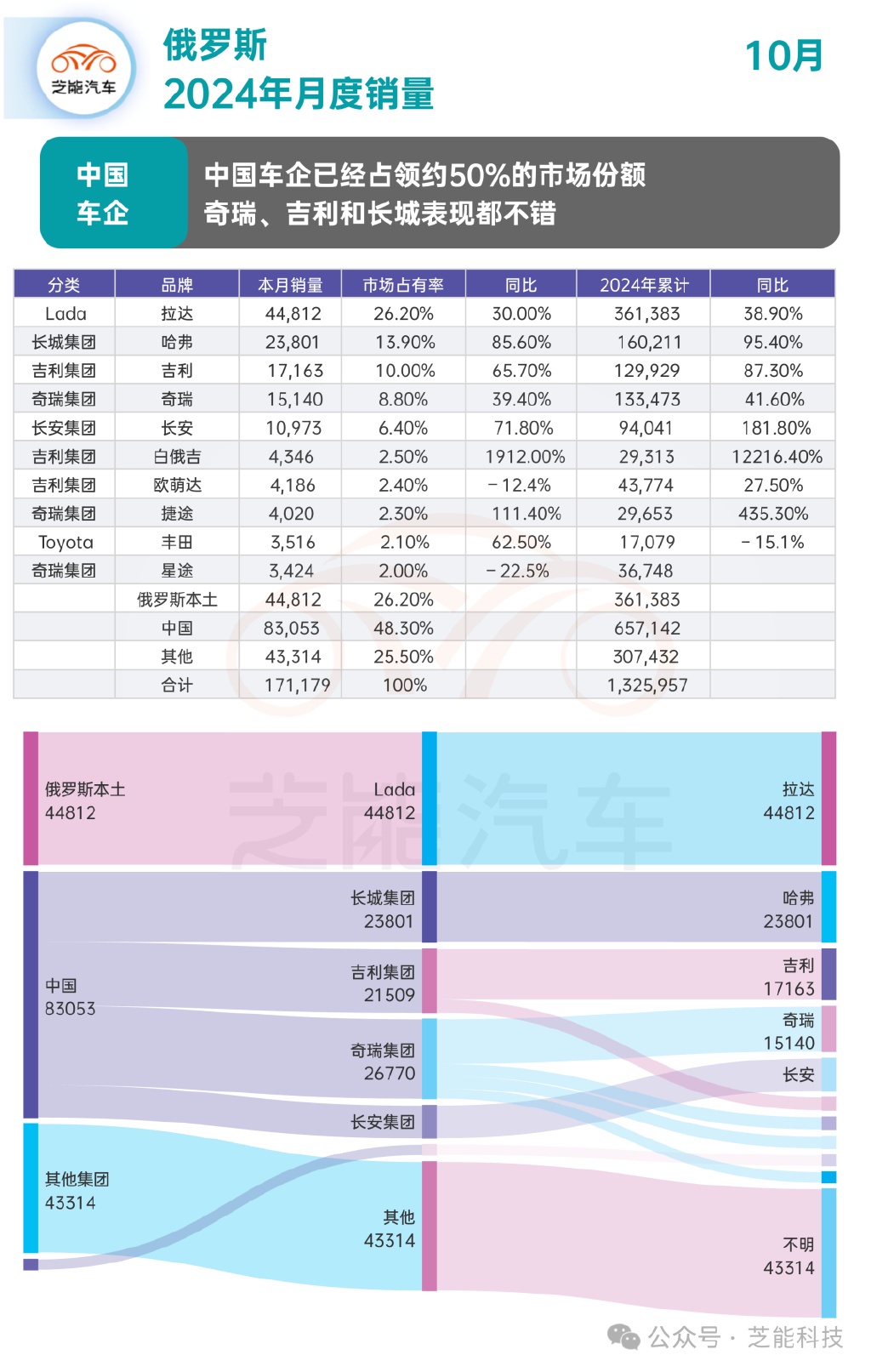 10 月份俄羅斯乘用車市場共售出 171,179 輛新車,中國車企的總銷量達到 83,053 輛,市場佔有率為 48.30%,接近一半,凸顯了中國車企在俄羅斯市場的重要地位,各品牌銷量可觀且增長強勁。