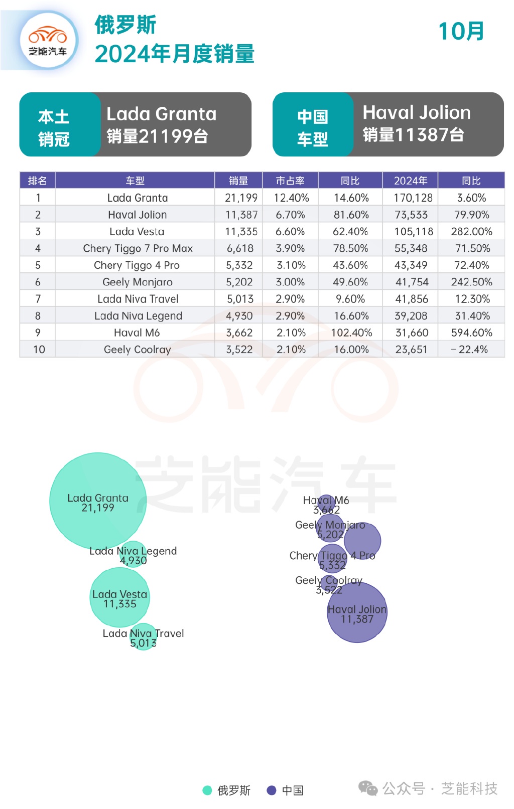 ● 拉達 Granta 依然是俄羅斯市場銷量最高的車型,10 月同比增長 14.6%,但市場份額從 16.5% 下降至 12.4%,拉達的市場統治力正在被中國品牌逐漸侵蝕。