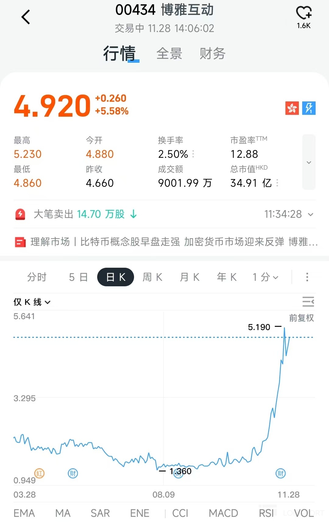截至 11 月 21 日,博雅互動已持有 2688 枚比特幣,平均每枚成本為 5.44 萬美元。以當日比特幣價格計算,博雅互動持幣浮盈超 1.17 億美元。當前 11.28 日盤中博雅互動的最新股價為 4.92 港元/股,年初至今已漲十倍左右。