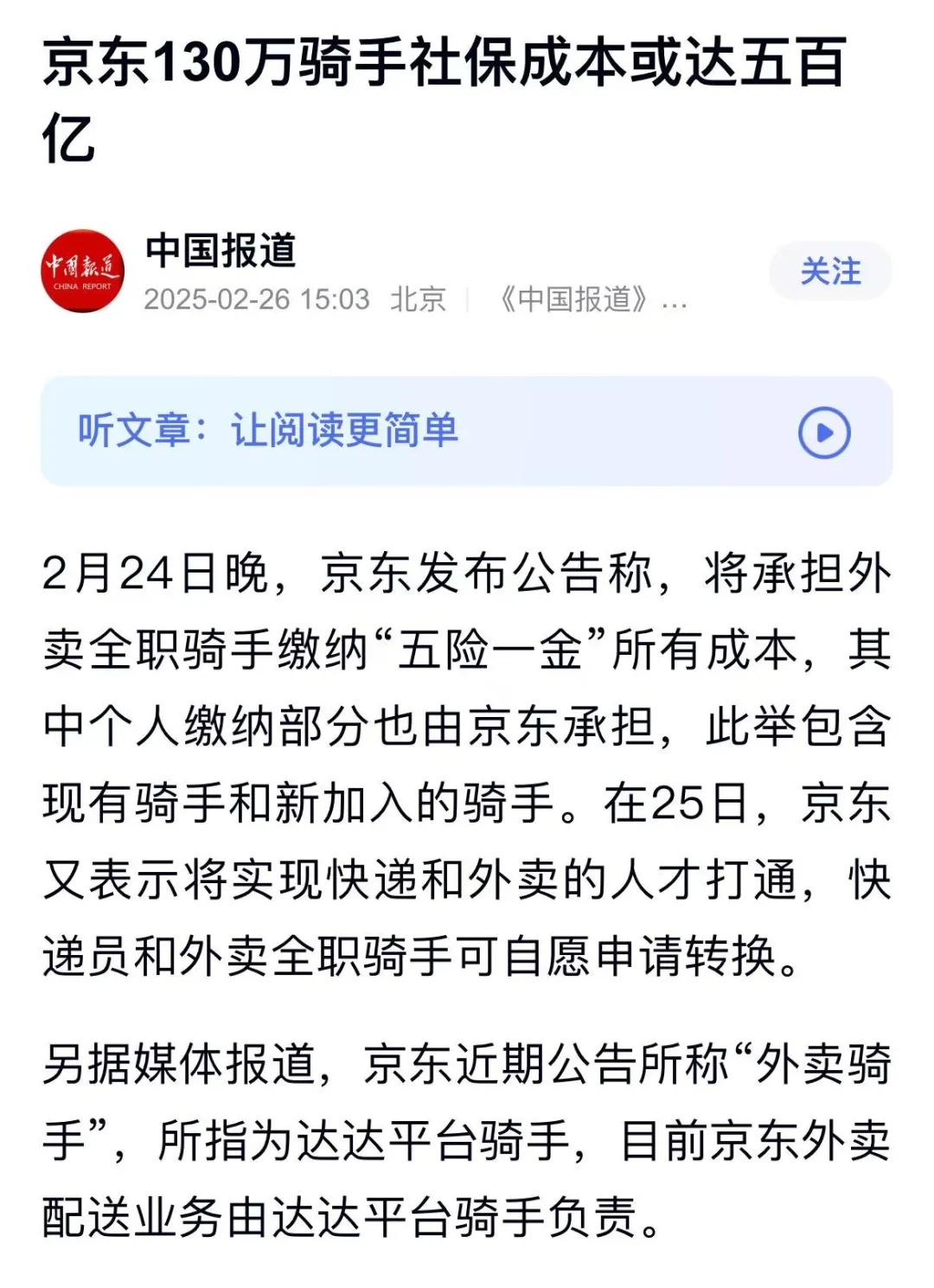2 月 19 日,京東再次通過 “京東黑板報” 宣佈,將為外賣騎手繳納五險一金,迅速引爆輿論。