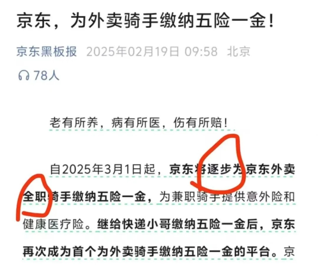 不過京東公告的標題略顯誇張,內容詳情其實是,“2025 年 3 月 1 日起,京東將逐步為京東外賣全職騎手繳納五險一金,為兼職騎手提供意外險和健康醫療險”。首先,繳納時間上是逐步;其次,社保適用範圍上是京東外賣全職騎手,兼職騎手只是意外險和健康醫療險。根據京東客服回應,京東外賣目前的騎手均為達達外包,針對全職騎手的招募細則正在制定中,給兼職騎手繳納意外險和健康醫療險實際上已經是行業標配,美團、餓了麼幾年前就已經開始推行。