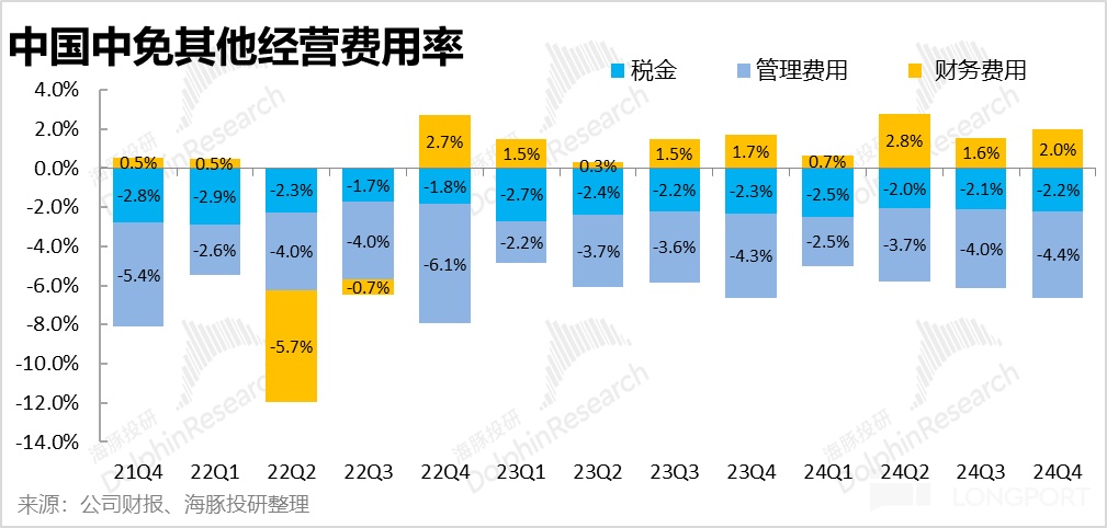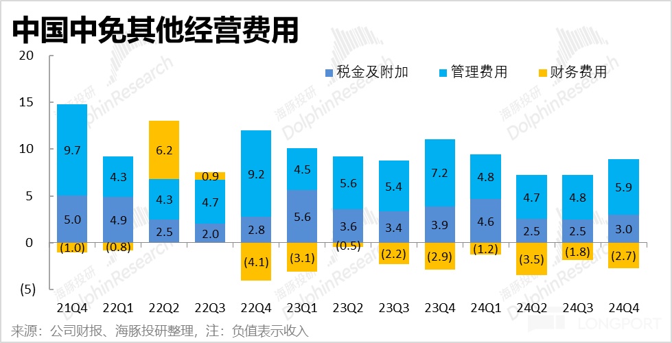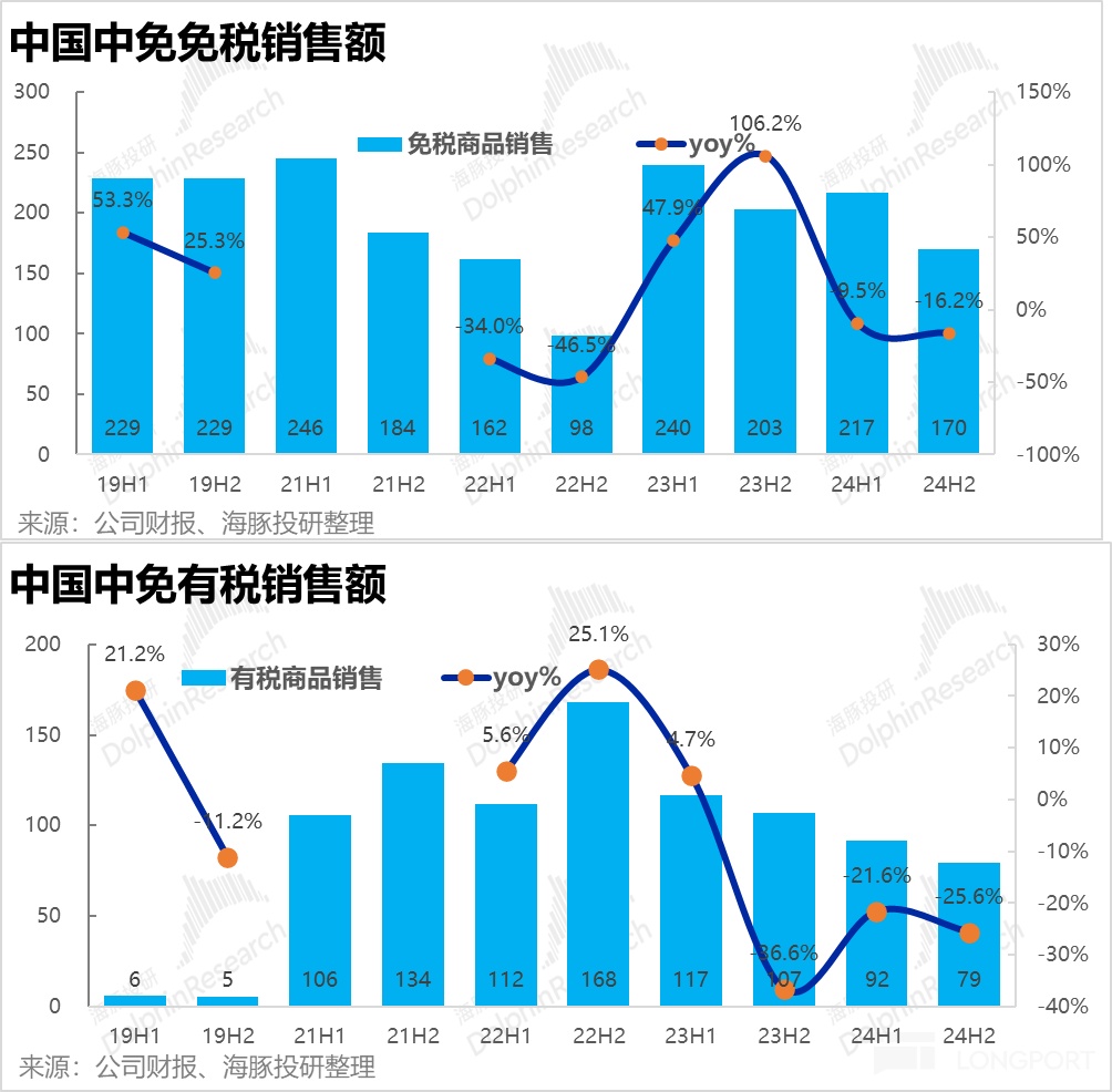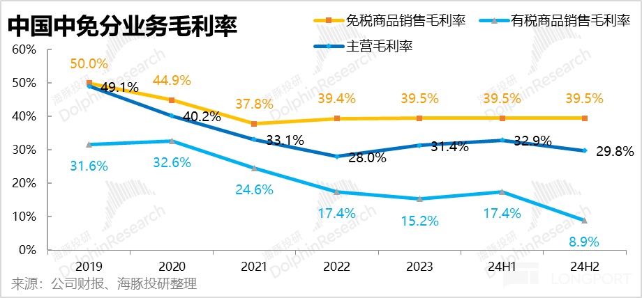 2、分收入類型,有税收入的同比降幅(-26%)依然明顯高於免税銷售收入(-16%),是導致公司整體銷售跌幅遲遲沒有好轉的主要原因。雖然我們本就認為,有税銷售屬於疫情期間的 “救火性” 角色,隨着核心免税業務的修復會自然淡出。但有税銷售在 2H24 畢竟仍佔據整體銷售額的近 32%,若一直無法止跌,集團整體營收也難以止跌。